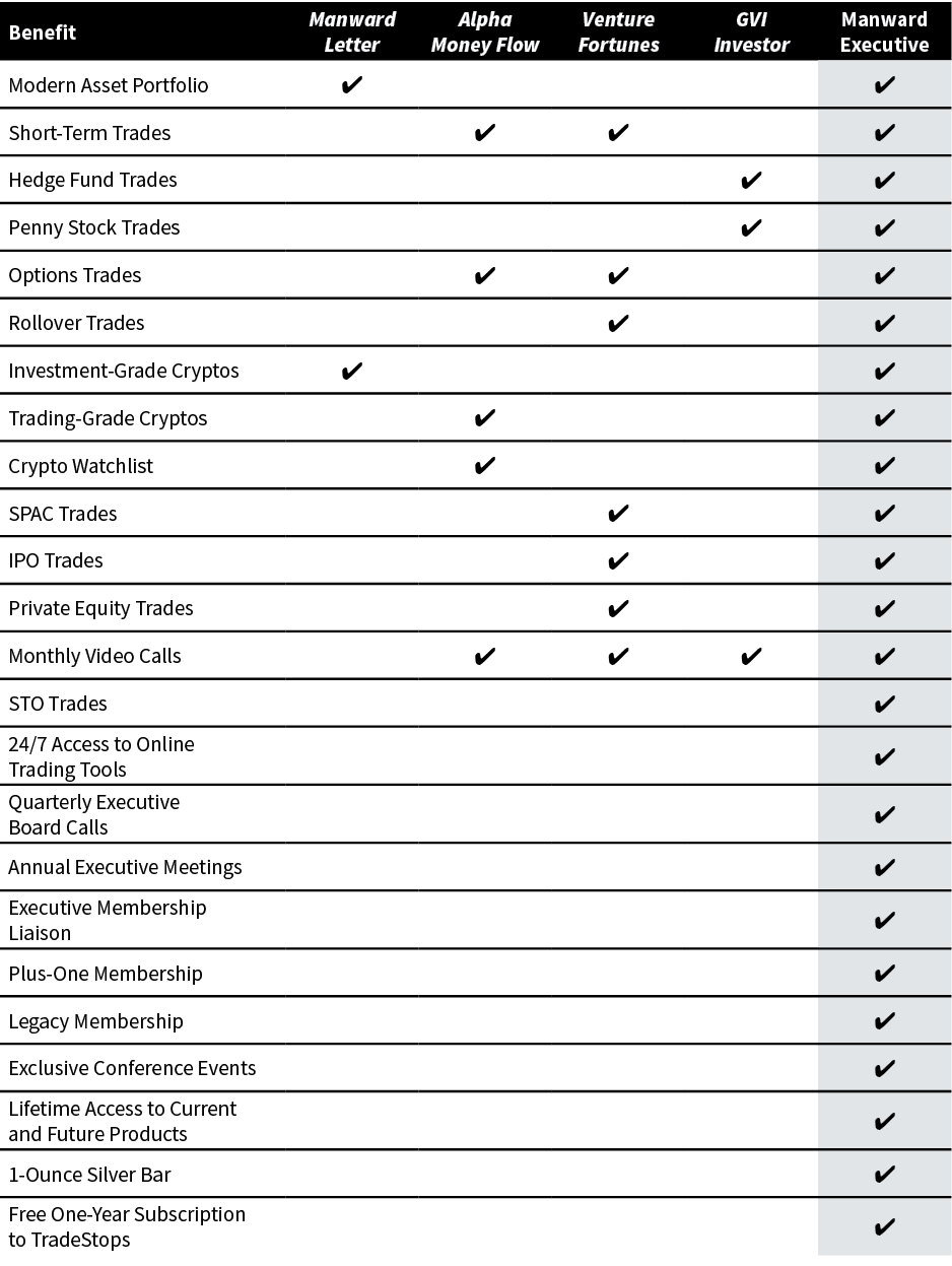 Our highest level of membership, Manward Executive is intended for only our most loyal, dedicated readers… those who want to actively participate in building their wealth.